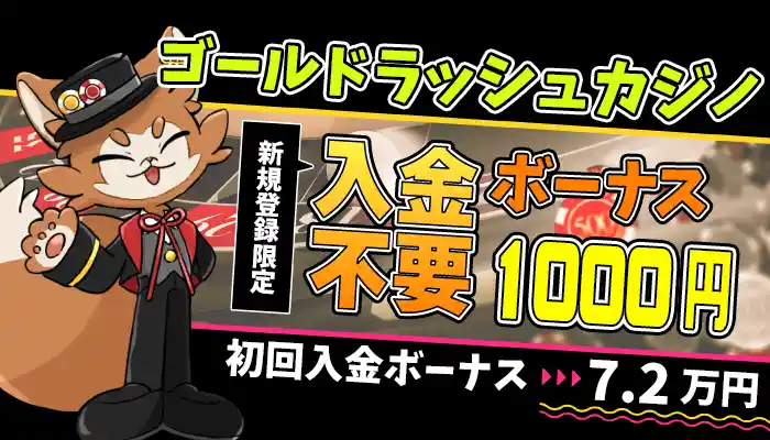 ゴールドラッシュカジノは閉鎖されました。以降、入金不要ボーナスの受取もできません。他社オンラインカジノの入金不要ボーナスもぜひチェックしてください。 ゴールドラッシュカジノで貰える【1,000円入金不要ボーナス】と【最大72,000円(入金額に対して...
